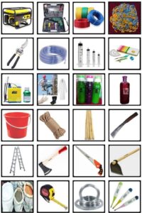 Generator, Drill Machine, Electric Wire/Instrument, Hard Pipe, Cutter, Vaccine & Water Level Pipe, Injection, Geometry Box, Spray Machine, Pesticide (Dustpan, Malathion), Vaccine, Bucket, Rope, Bamboo, Knife, Saw, Axe, Fertilizer, Inch tape, Control stick, Thermometer